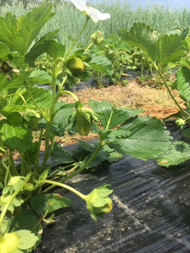 With the cold Spring, the Strawberry Season has been pushed back 2-3 weeks. We hope to have some strawberries ready by Memorial Day weekend. We will announce our Opening Day as soon as possible. As you can see in the photo, there are some berries that are currently half-formed. They will need about 2 more weeks of sunshine to ripen into their full sweet, juicy redness.