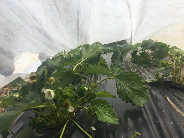 Typically, we have a few berries ripening by early to mid-May, and last year we opened the stand by the 13th. NOT this year! April & May have had many cold days and nights, including several sub-32 degree nights. We had to pull the blankets/covers out of storage again this weekend, in the attempt to save as many berries as possible.