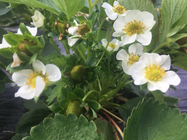Strawberries are looking great, much better than last year. The cool weather this upcoming week will slow the process somewhat, but hopefully there are no frost or freezing temps (like last year when many berries were lost). We should be starting to harvest in about two weeks. Currently there are a lot of flowers and some berries starting to form.